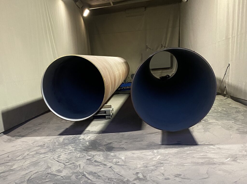 De grote cabine is 21 meter lang 6 meter breed en 5 meter hoog hierin straalt KD- Straal- en Spuitservices handmatig met korund, en verwijderd het een laag coating, roest of de walshuid van het project.